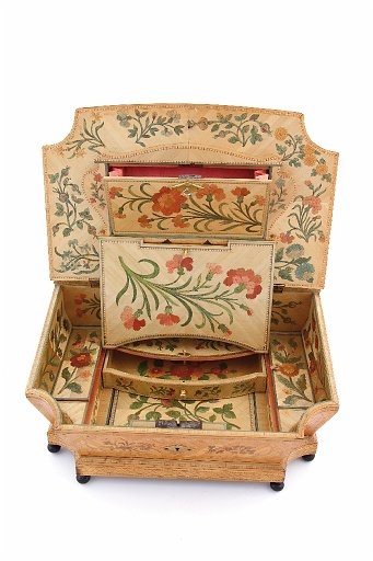 Early 19th century examples tended to have thick veneers of mahogany, rosewood, yew or fruitwoods with brass inlays, fine lines or floral swags. Some had fine mother of pearl inlay on the lids and marquetry of naturalistic, neo-classical or geometric designs.